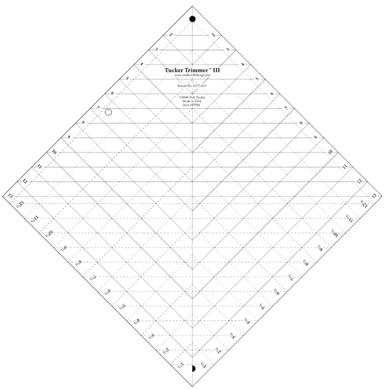 The third in the Tucker Trimmer series of rulers, this version of our Tucker Trimmer is used for any block or unit that is larger than a 6in finished block size. It has all of the sizes of the Tucker Trimmer 1 plus thirteen additional size options up to and including trimming blocks to 13in (that will finish to 12.5in when sewn). I love to use this tool to trim down my Lemoyne Star blocks made with my Rapid Fire Lemoyne Star tool and any type of block that needs to be trimmed and squared to a specific size. A terrific tool with all the same benefits as the original Tucker Trimmer.