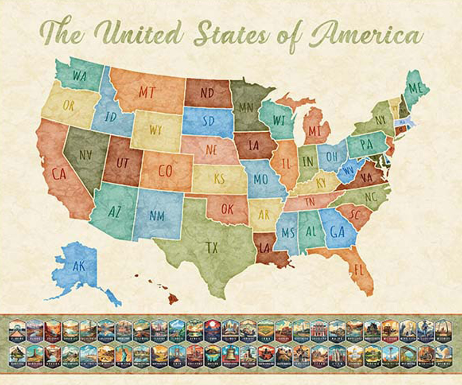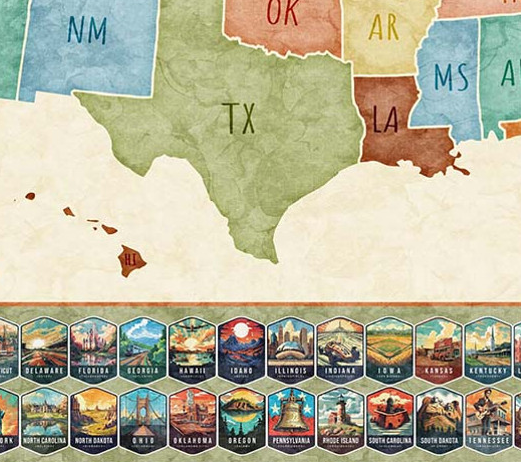 The design has the states in a watercolor print. At the bottom of the panel are the emblems for each state. The emblems measure approx. 1-1/2" x 2-1/4" each.